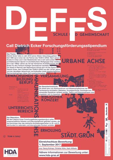 Dietrich Ecker hätte im Jahr 2018 seinen 80sten Geburtstag gefeiert. Seit 1966 war er einer der vier Partner des TEAM A GRAZ. Die Arbeit im Rahmen des Stipendiums könnte sich mit der Person Dietrich Ecker, dem Frühwerk des TEAM A GRAZ aus den 1970er Jahren und den damaligen Akteuren und kulturellen sowie gesellschaftlichen Rahmenbedingungen auseinandersetzen. Einreichschluss Bewerbung: 1. Oktober 2017