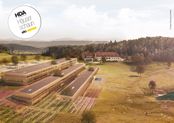 Drei schmale langgestreckte Baukörper in Holzbauweise scheinen über dem Gelände zu schweben oder graben sich ein. Atrien mit heimischer Bepflanzung sowie begrünte Dächer unterstreichen das gestalterische Anliegen, die Landschaft durch das Gebaute fließen zu lassen. Natürliche Verschattung und Belüftung ergänzen die optimierte Klimatechnik im Low-Tech Standard.