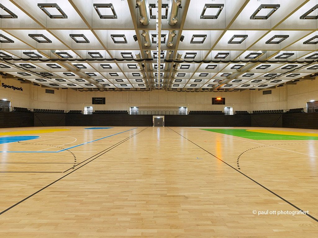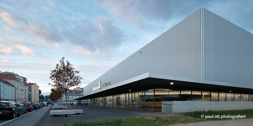 Über einen großzügig konzipierten Platz – eine Erweiterung des öffentlichen Raums im Südwesten – betritt man den neuen Sportpark. Das Hallenvolumen, betont durch die geschoßhohe Verglasung des Erdgeschoßes, verbindet die Freiraumqualitäten – Vorplatz, Sportflächen und Parkanlage – mit dem Inneren des Gebäudes zum „Sportpark“.