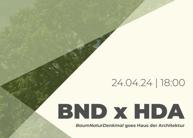 Vorträge, Podiumsdiskussion, Architekturtage 2024Mit der Veranstaltung BNDxHDA rücken das Projekt BaumNaturDenkmal gemeinsam mit dem HDA sowie den ZT-Büros Nussmüller, Hohensinn und Freiland eine resiliente und zukunftsfähige Bauplanung in den Fokus. Architekturbüros, VerantwortungsträgerInnen, Bauträger und Interessierte sind eingeladen, den Impulsen zu folgen und sich auszutauschen.