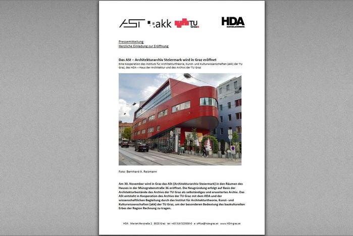 EröffnungAm 30. November wird in Graz das ASt (Architekturarchiv Steiermark) in den Räumen des Hauses in der Münzgrabenstraße 36 eröffnet. Die Neugründung erfolgt auf Basis der Architekturbestände des Archivs der TU Graz als selbständiges und erweitertes Archiv. Das ASt entsteht in Kooperation des Archivs der TU Graz mit dem HDA und der wissenschaftlichen Begleitung durch das Institut für Architekturtheorie, Kunst- und Kulturwissenschaften (akk) der TU Graz, um der besonderen Bedeutung des baukulturellen Erbes der Region Rechnung zu tragen.