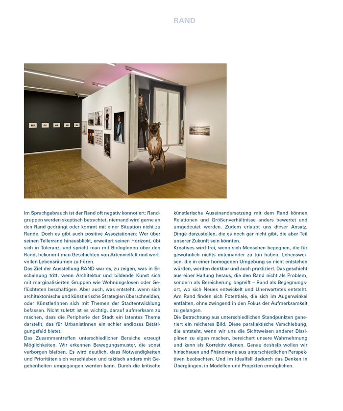 Das Ziel der Ausstellung RAND war es, zu zeigen, was in Erscheinung tritt, wenn Architektur und bildende Kunst sich mit marginalisierten Gruppen wie Wohnungslosen oder Geflüchteten beschäftigen. Aber auch, was entsteht, wenn sich architektonische und künstlerische Strategien überschneiden, oder KünstlerInnen sich mit Themen der Stadtentwicklung befassen. Nicht zuletzt ist es wichtig, darauf aufmerksam zu machen, dass die Peripherie der Stadt ein latentes Thema darstellt, das für UrbanistInnen ein schier endloses Betätigungsfeld bietet.