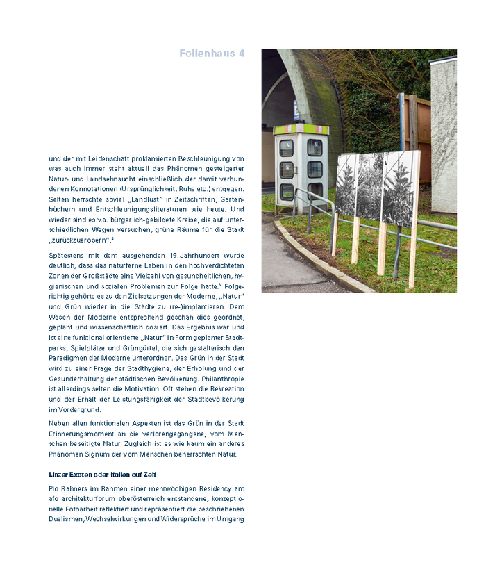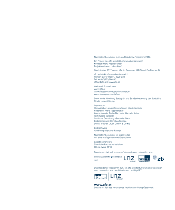 PublikationSeit Sommer 2016 bietet das afo architekturforum oberösterreich ArchitektInnen und KünstlerInnen die Möglichkeit, jeweils vier bis sechs Wochen in der hauseigenen Atelierwohnung zu leben und zu arbeiten. Die Auseinandersetzung während des Aufenthalts fokussiert auf den Themenkomplex Raum, Architektur und Stadt. Die bisherigen Gäste waren die Szenografin Nadia Schrader (D), die bildende Künstlerin Josephine Sweeney (UK), der Architekt und Urbanist Martin Benavidez (ARG) und der Fotokünstler Pio Rahner (D).