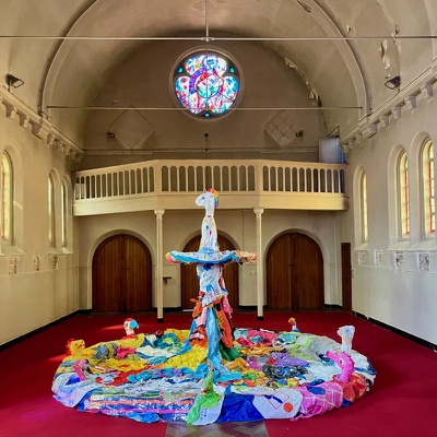 InstallationDas Bronze-Stadtmodell am Schlossberg zeigt Linz um 1800. Tom Bogaert, heuer Gastkünstler des afo, errichtet darüber eine mehrfarbige Installation aus Agar-Agar.