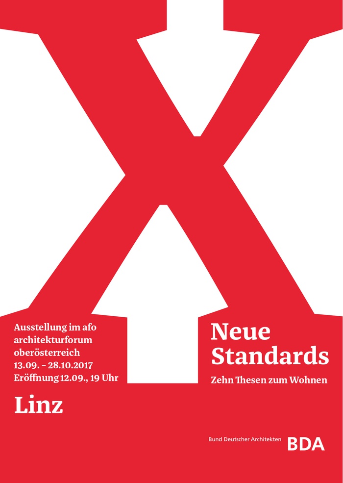 Die Ausstellung „Neue Standards. Zehn Thesen zum Wohnen“ wurde von Olaf Bahner und Matthias Böttger für den Bund Deutscher Architekten BDA kuratiert und im Deutschen Architektur Zentrum DAZ in Berlin erstmalig präsentiert. Ausstellung, Publikation und Rahmenprogramm werden durch das Bundesministerium für Umwelt, Naturschutz, Bau und Reaktorsicherheit BMUB und das Bündnis für bezahlbares Wohnen und Bauen gefördert.