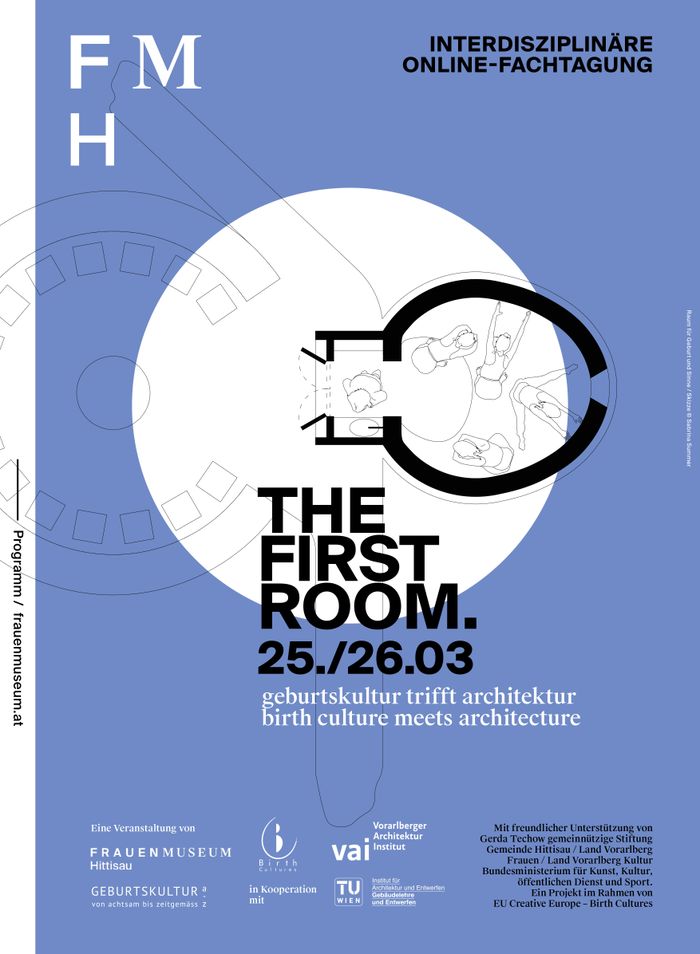 Der Titel THE FIRST ROOM ist dem Healthcare Schwerpunkt am Institut für Architektur und Entwerfen der TU Wien entnommen, in dessen Rahmen Studierende im WS 20/21 Räume für den Start ins Leben entworfen haben. (Leitung Prof.in Tina Greogric. Betreuung: Univ. Ass.in DI in Evelyn Temmel, Univ. Lekt.in DI in Josephine Herrmann. Externe Expertin: DI in Anka Dür, IG Geburtskultur a-z)